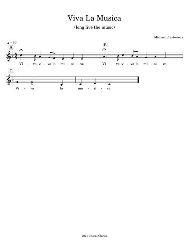 This is a famous round (translated to: love live the music) that can be performed in 3 parts. It can be sung in three part treble voices, three part tenor/basses voices, or a mixture.
